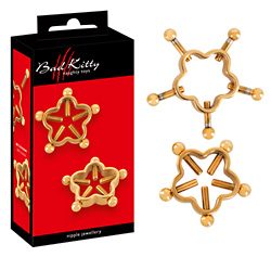 These two extremely lightweight nipple clamps Nipple Jewellery Golden Flower from Bad Kitty pinch the nipples and can be adjusted with 5 screws. The sensation ranges from gentle to extremely arousing. The plain but stylish flower design of these gold-coloured metal clamps is extremely elegant and makes them look like a real piercing.